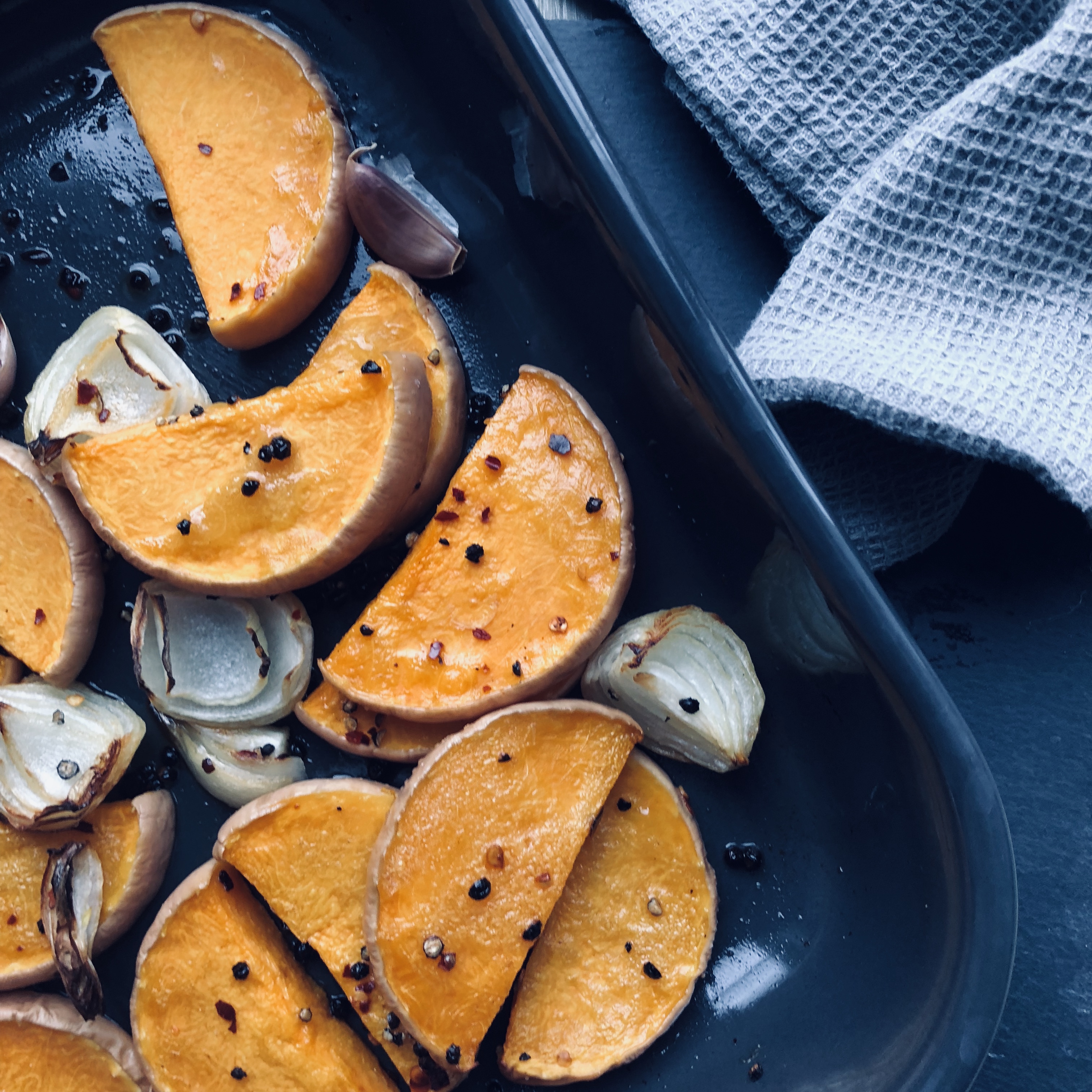 - Chop butternut squash into large chunks (leave the skin on). Chop onion into large bits and take the skin off of the garlic gloves, leave them whole. Place into a roasting tin.