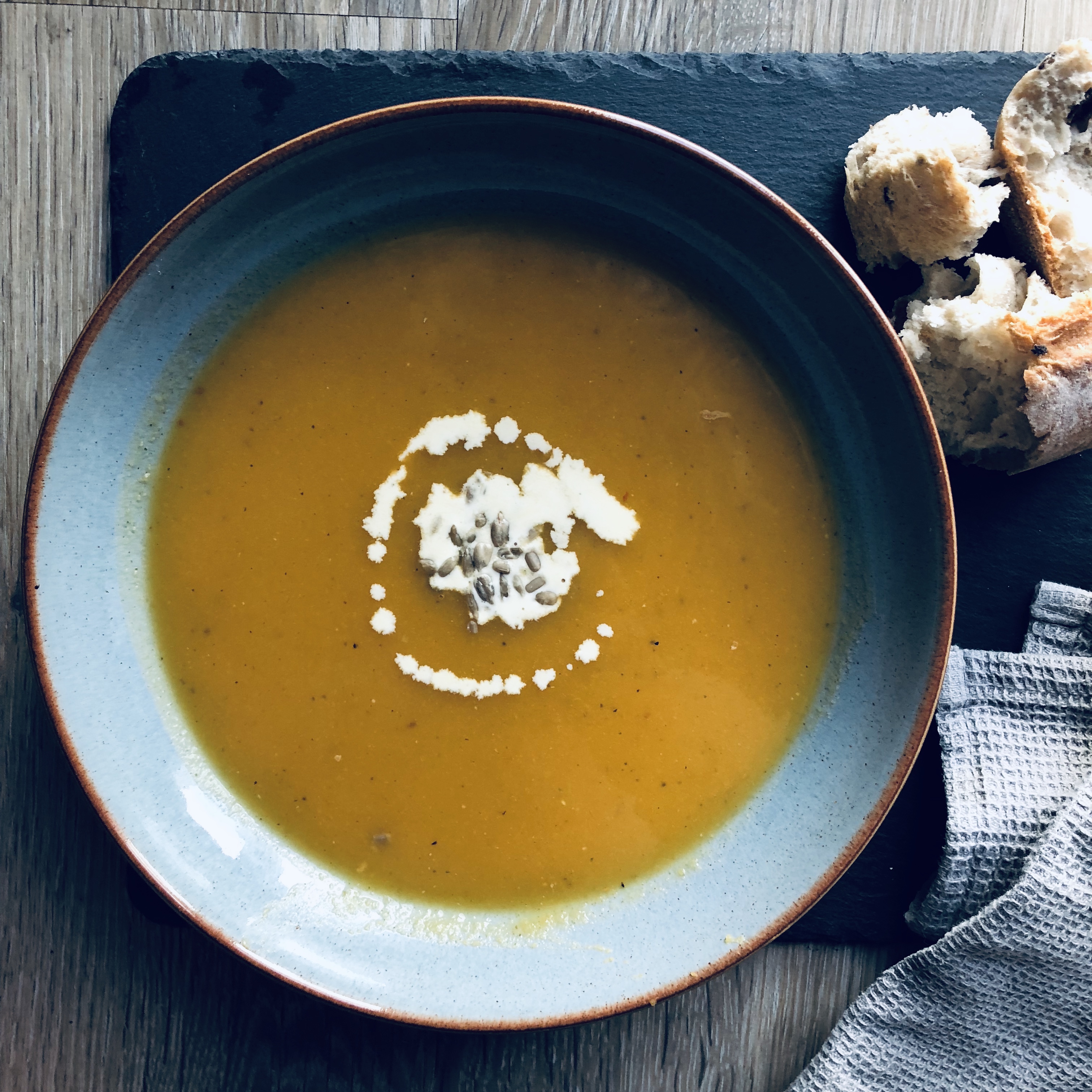 - Once the butternut squash is cool enough to handle remove the skin and add to a saucepan, along with the roasted onion and garlic.