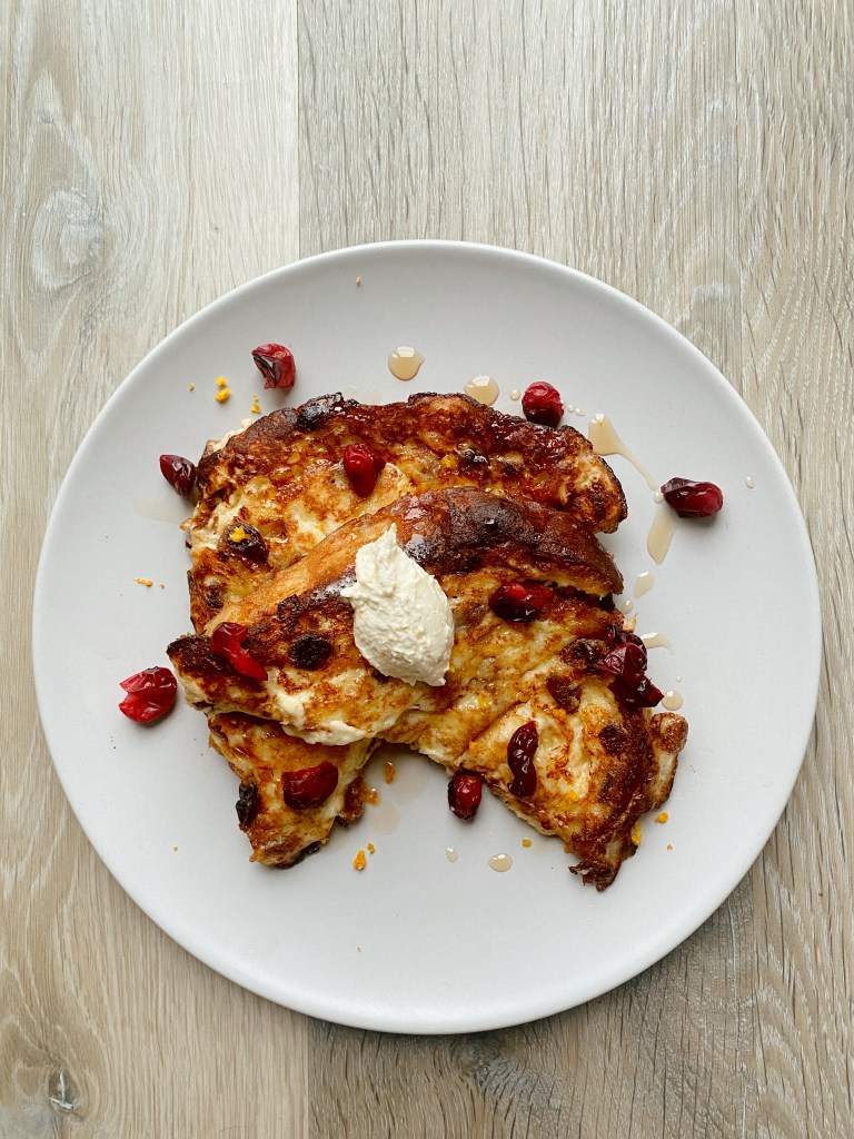 - It’s time to plate up! Put the french toast on a plate, drizzle the maple syrup over, scatter the dried cranberries and 1 tsp of your orange cream. If you have some zest left on the orange you can scatter that over too.
