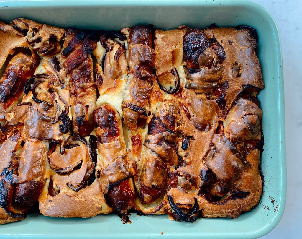 - Take the preheated dish out of the oven. Evenly place the pigs in blankets into the dish, add the onions over the top and then pour oven your pre-made batter mix. Pop back in the oven for around 40 mins until the batter has risen and is lovely and golden. Make sure you don’t open the oven before the batter has risen!