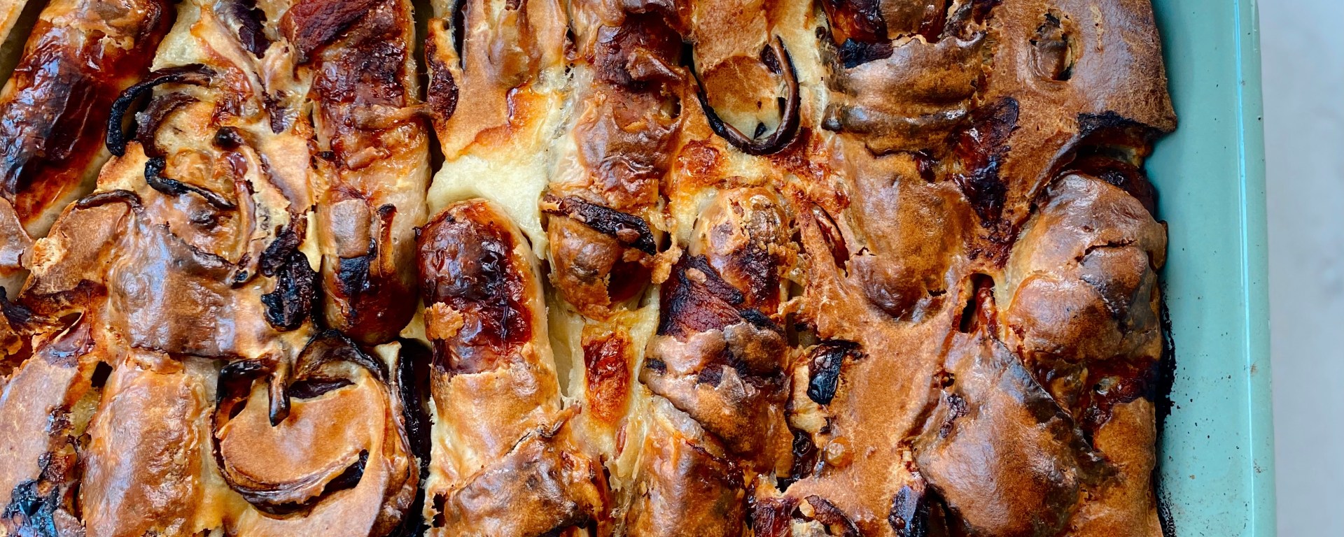 - Take the preheated dish out of the oven. Evenly place the pigs in blankets into the dish, add the onions over the top and then pour oven your pre-made batter mix. Pop back in the oven for around 40 mins until the batter has risen and is lovely and golden. Make sure you don’t open the oven before the batter has risen!