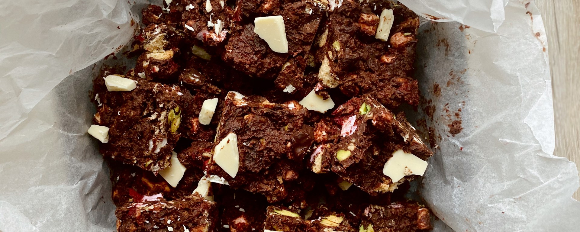 - Now that the chocolate mix has cooled, you can stir in the marshmallows, raisins, crushed salted pretzels, cranberries and crushed pistachios. Stir together.