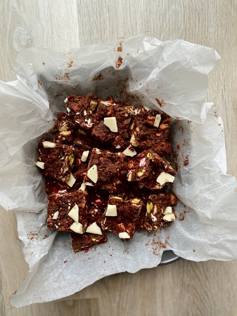 - Pour into the pre-lined tin and set in the fridge for a minimum of two hours.