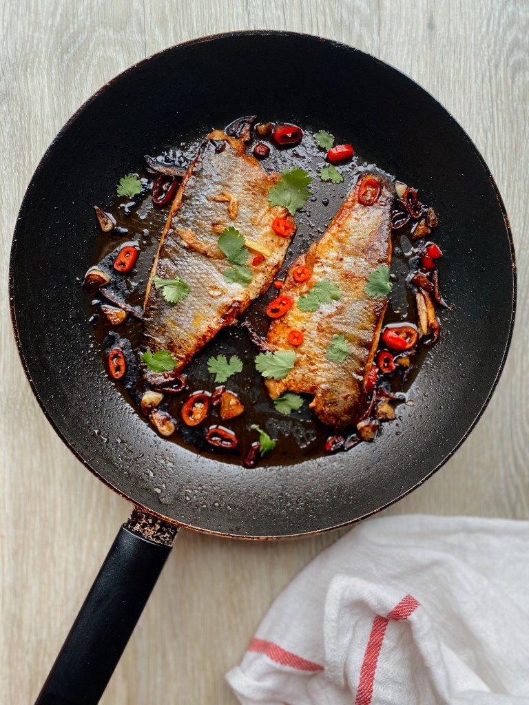 - After the minute is up, add the garlic, chilli and ginger to the pan. Then pour over the sauce. Cook the fish for a further minute and a half skin side down before flipping over and cooking the fillet for another two minutes.