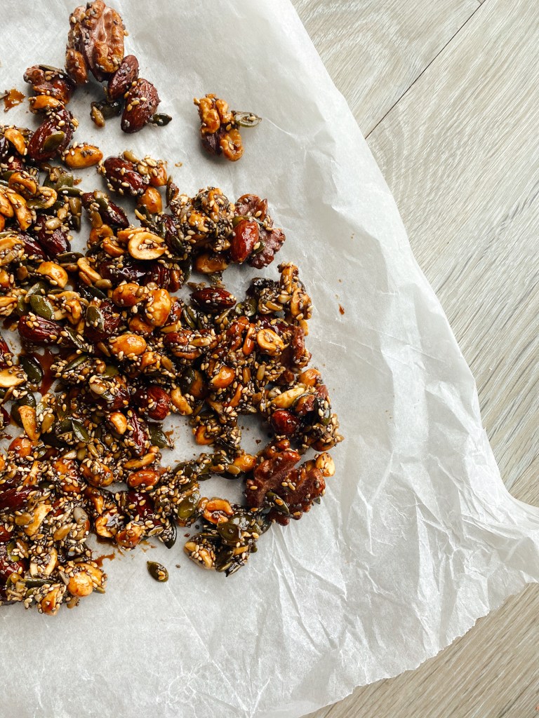 - Pour the roasted nuts into a large mixing bowl, with the rest of the seeds. Pour over your miso caramel and mix until fully coated.