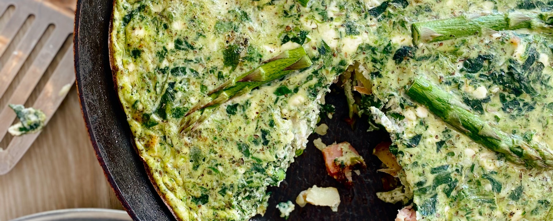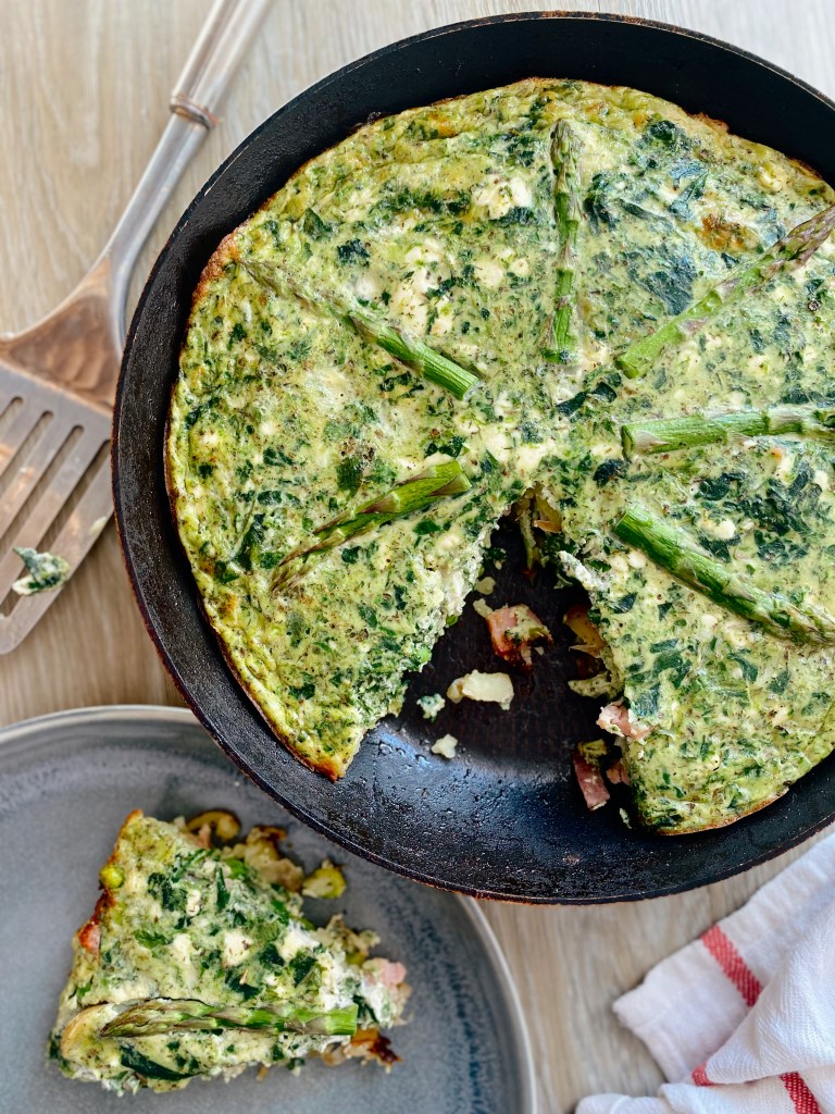 - Evenly spread everything in the pan, so that the base cannot be seen. Pour over your egg mixture. Place your asparagus spears into the mixture pushing them in slightly. Cook on the hob over a medium-high heat for 10 mins. Meanwhile, heat up your grill.