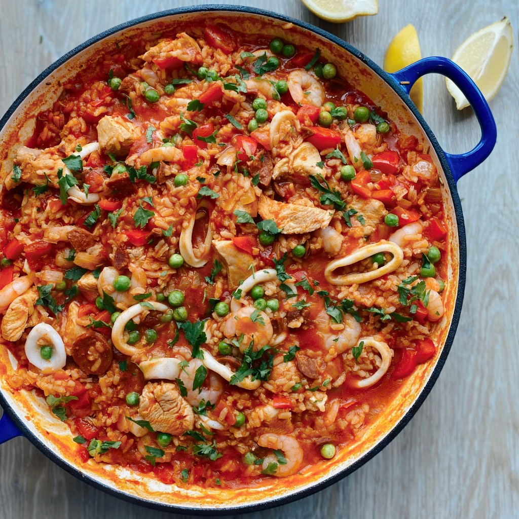 - Scatter with the cooked chorizo, prawns and squid and cook for a further 5 mins before adding your frozen peas. Take the paella off of the heat and place the lid back on, leave for 5 mins and let the peas cook in the residual heat.