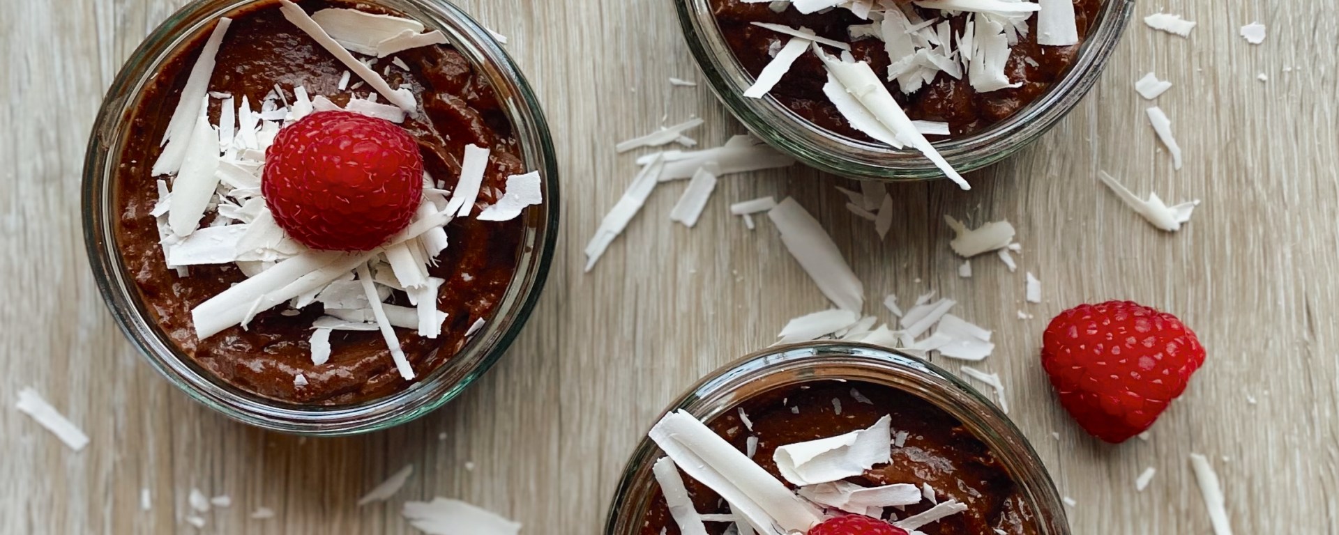 - Once ready to eat, shave the white chocolate by running the blade of a knife over the flat edge of the chocolate, this will create a swirl. Sprinkle over the mousse and top with a couple of raspberries.