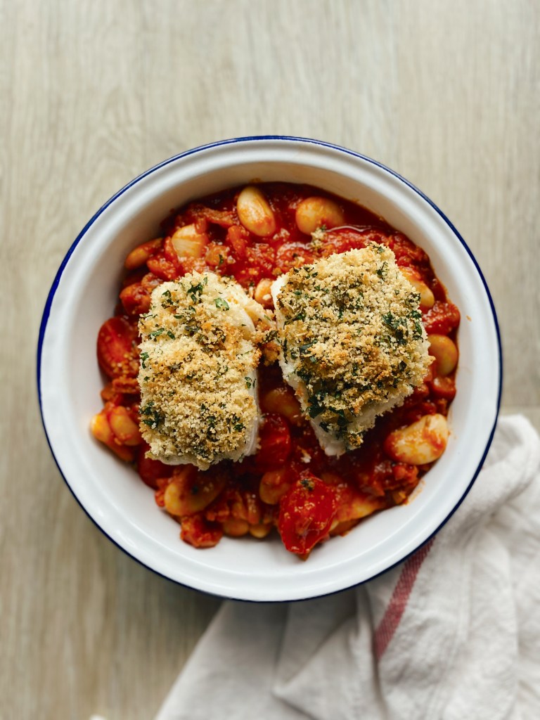 - After the 15 minutes is up, pour in the butter beans (with the water) and the chopped cherry tomatoes. Combine it all together. Lay the cod over the tomato mixture and sprinkle the crumbs over the top side of the cod.