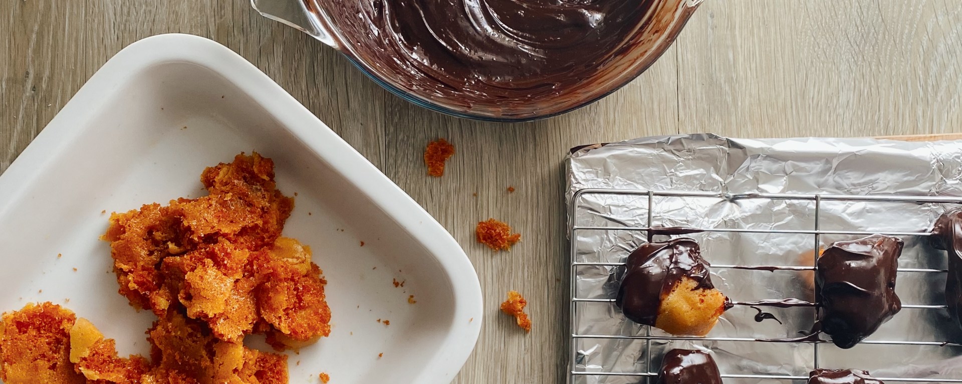 - Prep a cooling rack, with parchment or foil underneath. Smash your honeycomb into pieces and dip into the melted chocolate. Place onto the cooling wrack and allow any excess chocolate to drip through.
