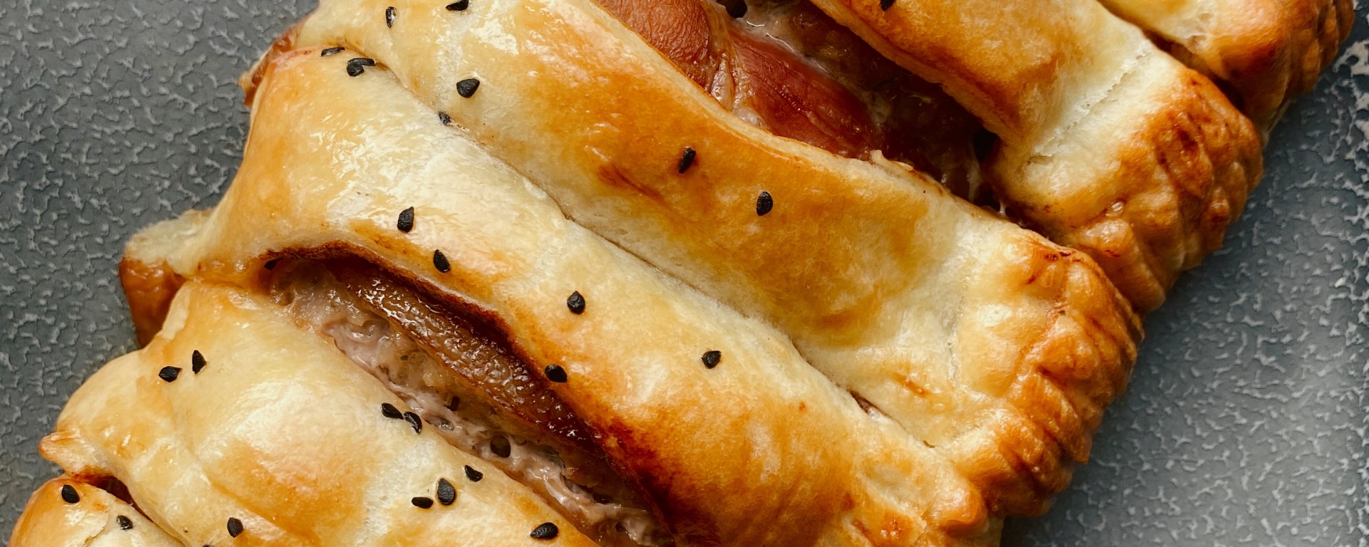 - Roll out the pastry sheet, keeping it on the paper that it came in and with the longest side facing you, so that the pastry looks horizontal. Spread the marmite evenly across the pastry. Lay the bacon rashers on top. Leaving a one inch gap from the side closest to you, add the sausage meat to create one long even sausage. Use the paper from the pastry to help roll the pastry on top of the sausage towards you. Secure the pastry and press together with a fork. Generously egg wash. Sprinkle with nigella seeds. Cut into 14 equal pieces. Pop on the baking tray and bake in the oven for 20 mins or until golden.
