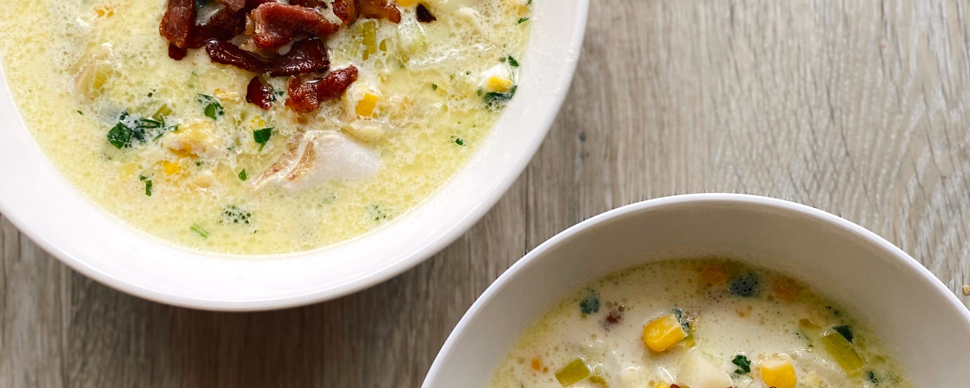 - Heat the oil and butter in a saucepan. Add the onion, leeks and celery. Sweat down until soft for 3-5 mins. Add the garlic and cook for a further minute before adding the sweetcorn and jersey royals and pour over the stock and sprinkle in the thyme. Simmer for 10 mins until the potatoes are soft.