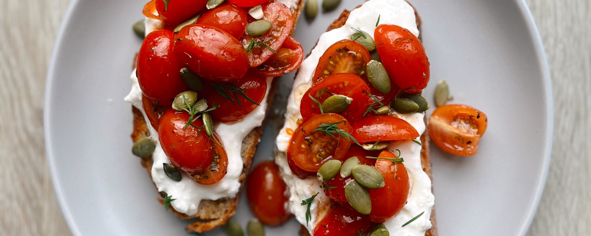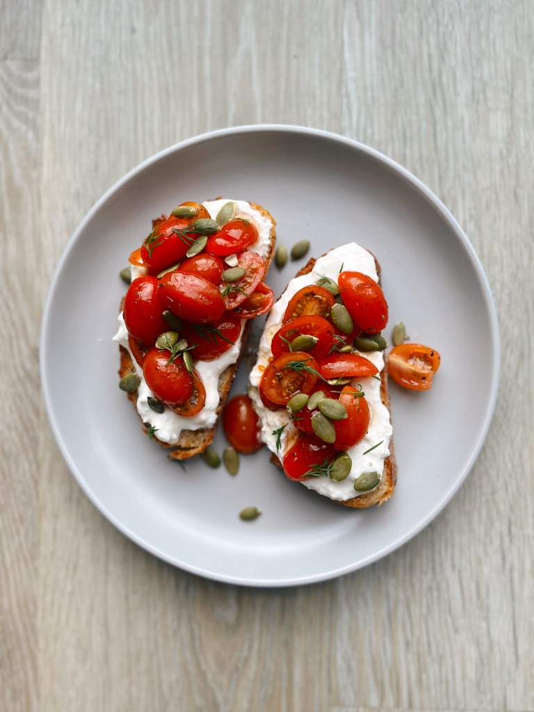 - It’s time to serve up! Spread the whipped feta over the bread, top with the tomatoes, sprinkle with pumpkin seeds and top with some fresh dill. Enjoy!