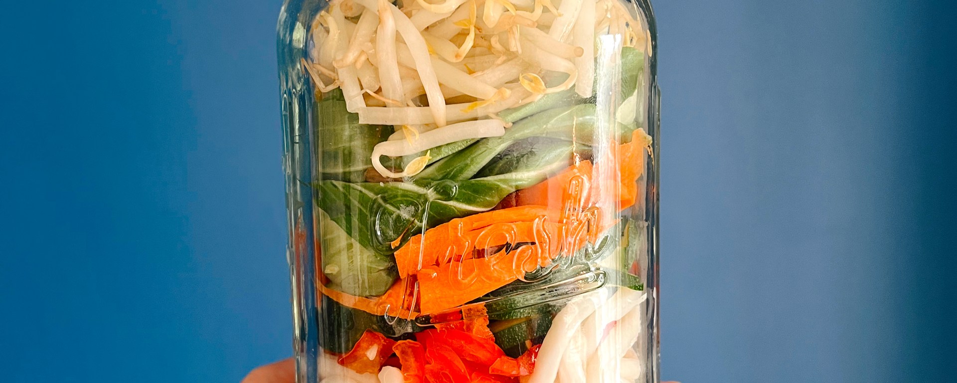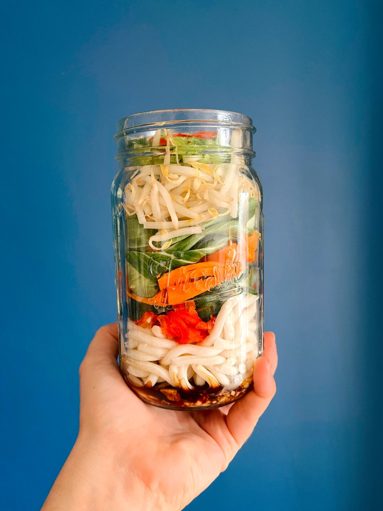 Pack the jar tightly, pour in the hot water, give it a shake and leave the hot water to ‘cook’ the veg for five mins before enjoying 🥰