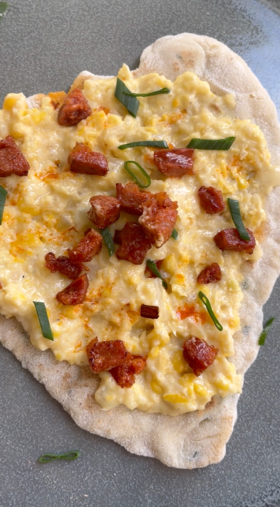 - Assemble the flatbreads by topping with the creamed corn, chorizo and snip over spring onions. Enjoy!